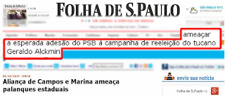 Como já dito e redito aqui neste espaço, Marina depois da aliança surpreendente que fez, passará a levar pau dia sim e dia também do imprensalão. Inclusive dos políticos aliados que cairam na conversa mole de que ela tinha ideologia e era coerente. Eu mesmo, só atribuia a ela a ingenuidade característica de quem não tem o traquejo político necessário. Me enganei, ela era ingênua e se revelou uma mal intencionada também.